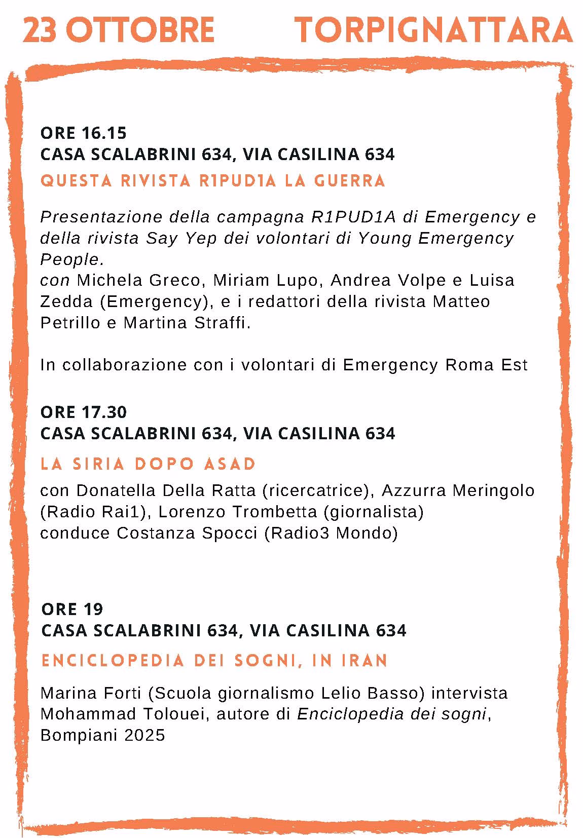 Ideato per favorire partecipazione e cittadinanza attiva nelle due periferie di Roma, realizzato grazie a un finanziamento Otto per mille della Chiesa Valdese e alla partnership con un’ampia rete di associazioni, il MIP prevede anche quest’anno tre giornate di incontri e dibattiti tra reporter, studiose, attiviste e ricercatori, con nuovi focus geografici e tematici: la transizione politica in Siria, la nuova letteratura iraniana, il declino della democrazia negli Stati Uniti, l’immaginario visivo sulla guerra dall’Afghanistan alla Palestina, le scritture della diaspora e il razzismo istituzionale, l’Asia in rivolta, il cambiamento climatico e il giornalismo narrativo, la rivista Say Yep e la campagna R1PUD1A di Emergency per il rispetto dell’articolo 11 della Costituzione, il diritto all’abitare e all’autorappresentazione nei quartieri popolari, con esperienze editoriali come la Rivista Corvialista.